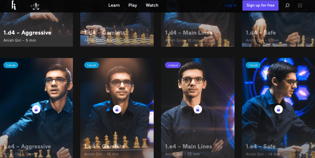 The video lessons are high-production-value documentaries and lessons from top grandmasters like Anish Giri, Maxime Vachier-Lagrave, and Simon Williams.